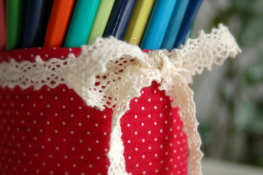 Ma délután viszont a kezembe akadt a piros, aprópöttyös anyagmaradék, amiből korábban csatos tárcát varrtam. Aztán eszembe jutott, hogy van rengeteg pamut csipkeszalagom. Kerestem még hobbiragasztót, és nekiláttam.